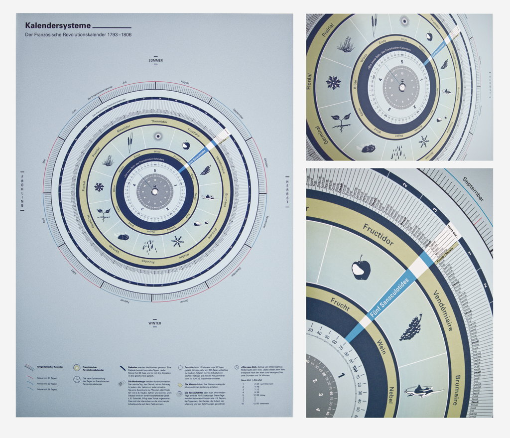Die Zusammenhänge und Verschiedenheiten historischer und aktueller Kalendersysteme habe ich mit Informationsgrafiken visualisiert. Wesentlicher Teil war die inhaltliche Auseinandersetzung und die Entwicklung der Ideen für die Informationsgrafiken.