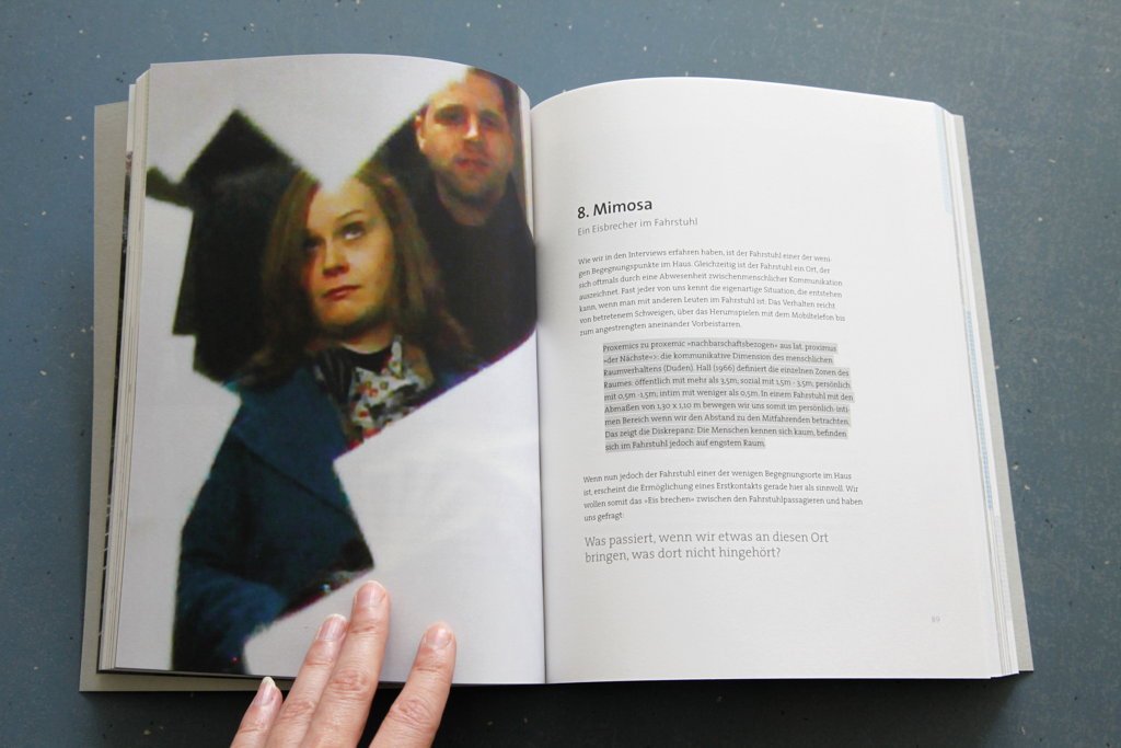 In einem Hochhaus mit 136 Wohneinheiten leben vergleichsweise so viele Nachbarn wie in einem Dorf. Das Zusammenleben ist jedoch meist anonym und von einem Zurückziehen in das Private gekennzeichnet. »Man kann nicht zu allen Kontakt aufnehmen. Da schottet man sich eher ab und bleibt allein« (Bewohner). Auf dem Grat zwischen Anonymität und Verbindlichkeit geht es in der Arbeit insbesondere darum, das Knüpfen der, für die Lebensqualität wichtigen, so genannten schwachen Bindungen zu fördern, sowie Designkonzepte zu entwickeln, die die Qualität nachbarschaftlichen Lebens erhöhen. Mit Hilfe von Interventionen, dem bewussten Eingreifen in die existierende Nachbarschaft, wird der Bezug der Menschen zu ihrem direkten Umfeld exploriert und der bestehende Nachbarschaftsbegriff hinterfragt.