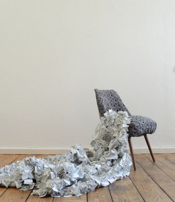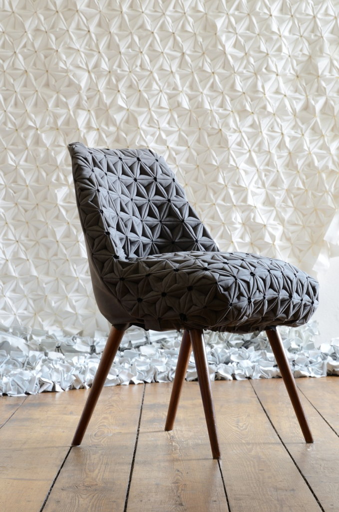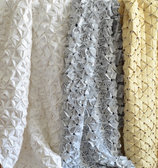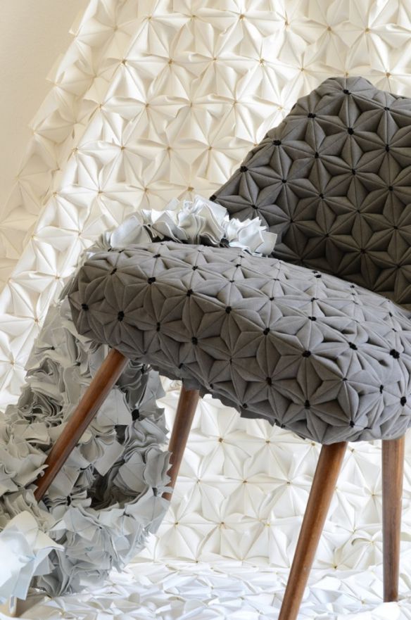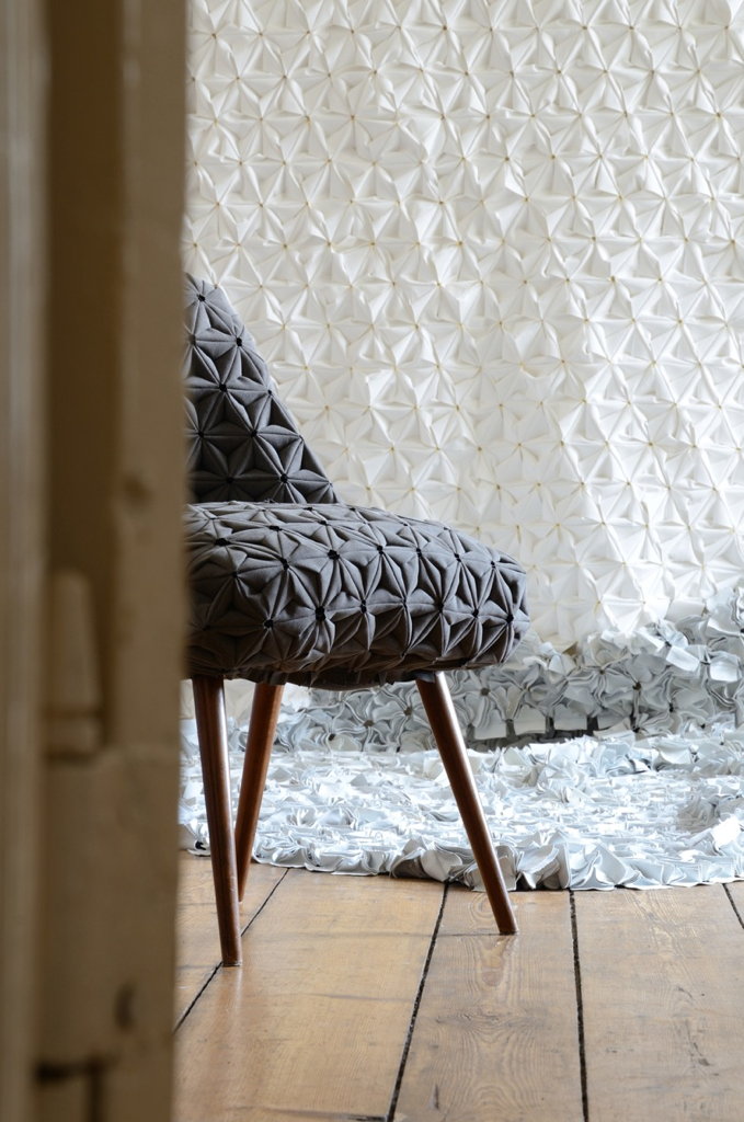 Das Projekt »Strukturen im Raum- textile Strukturen« befasst sich mit dem Dialog von Techniken und Material. Hierzu lotet es in einem interdisziplinären Prozess die Verbindungen zwischen Mode und Produktdesign neu aus. Dem Modedesign entliehene Techniken verbinden sich mit der Kunstform des Faltens und lassen eine vielgestaltige Kollektion taktiler Oberflächen entstehen, deren Verwendungsmöglichkeiten mannigfaltig sind und die sich nicht auf eine der genannten Disziplinen beschränken.