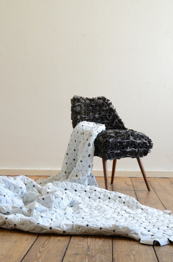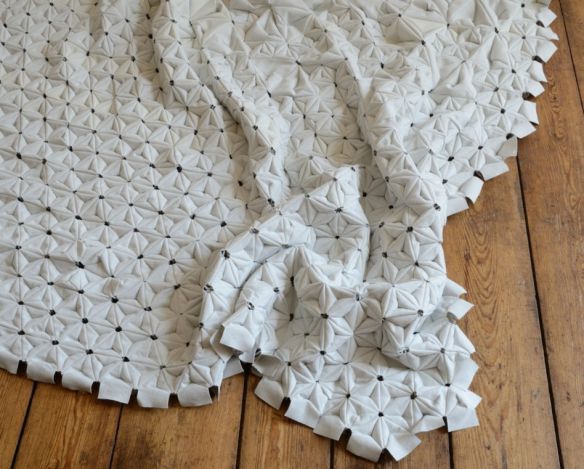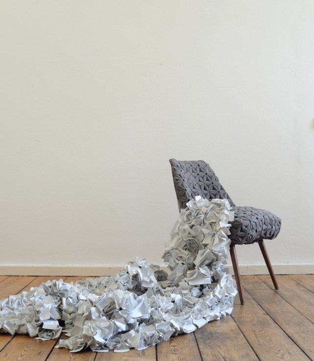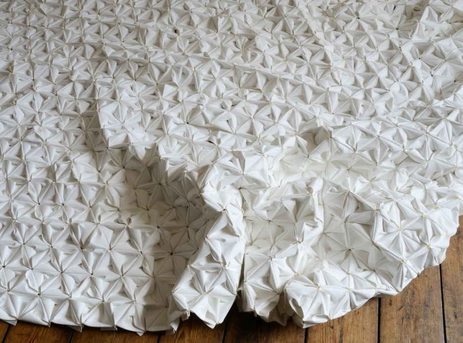 Ausgehend vom Textil als flaches, zweidimensionales Medium, entwickeln sich durch gezielte Faltungen und Nähte komplexe dreidimensionale Einzelstrukturen, die sich dann in multiplizierter Form durch eine Nähchoreographie in einer Metastruktur miteinander arrangieren und erweitern lassen.