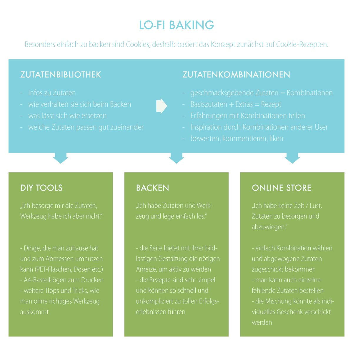 Durch meine Leidenschaft für das Backen fragte ich mich, wie man andere Menschen dazu animieren kann, ebenso gerne zu backen wie ich. Mit dem Konzept »Lo-Fi Baking« werden die entscheidenden Anforderungen erfüllt, um einen Backmuffel zu bekehren: »Mit wenigen Mitteln und geringem Aufwand etwas Selbstgebackenes herstellen zu können.«