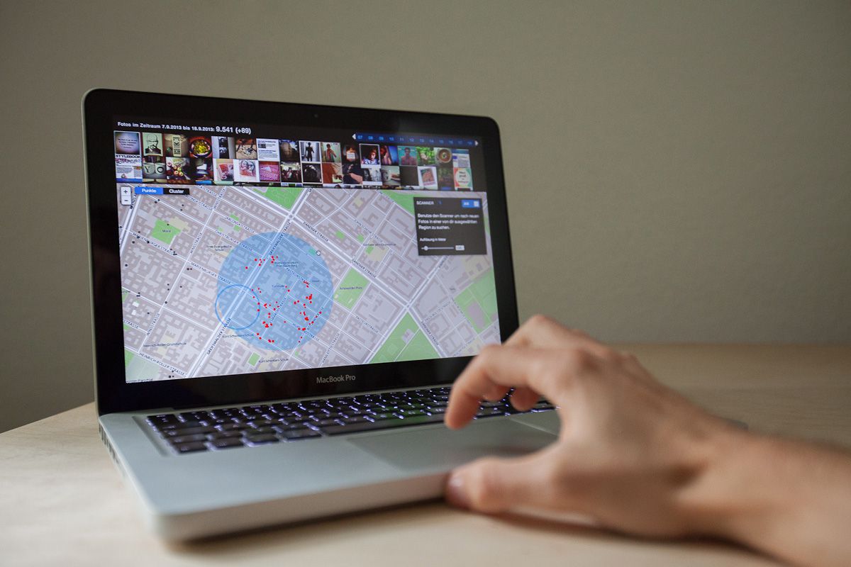 Mittlerweile sind Kameras so klein und erschwinglich geworden, dass viele Menschen täglich mit Kameras ausgestattete Smartphones in ihren Hosentaschen mit sich führen und damit Bilder zum Beweis unserer Existenz machen. Durch die Verortung der Daten schaffen wir gemeinsam ein hochaufgelöstes Abbild einer Zeit, in der jeder ein Datensammler und Dokumentar ist. Das Zurückbringen von Fotos an den Ort ihrer Entstehung soll den Menschen in ihrer eigenen Nachbarschaft vor Augen halten, was ohnehin jeder im Internet sehen kann. In der einst so anonymen Stadt wird das Smartphone mit Instagram schließlich das Fenster zum Hof.