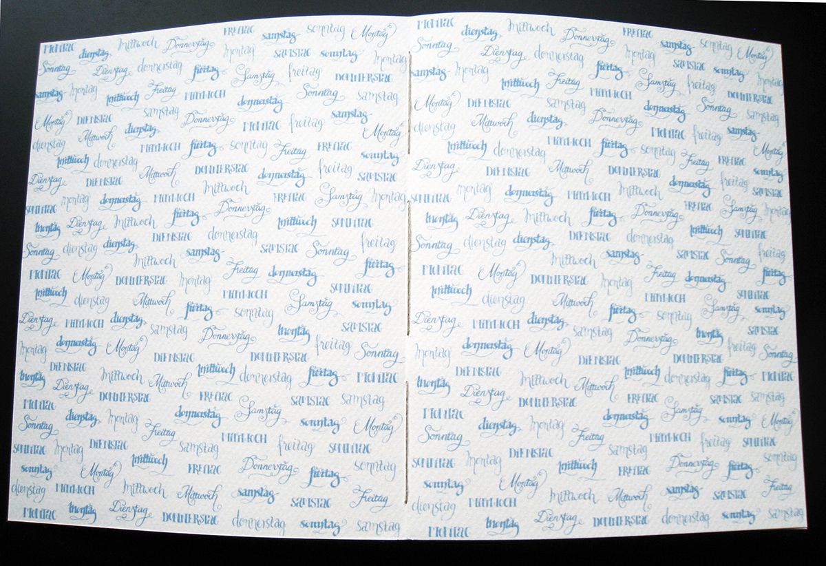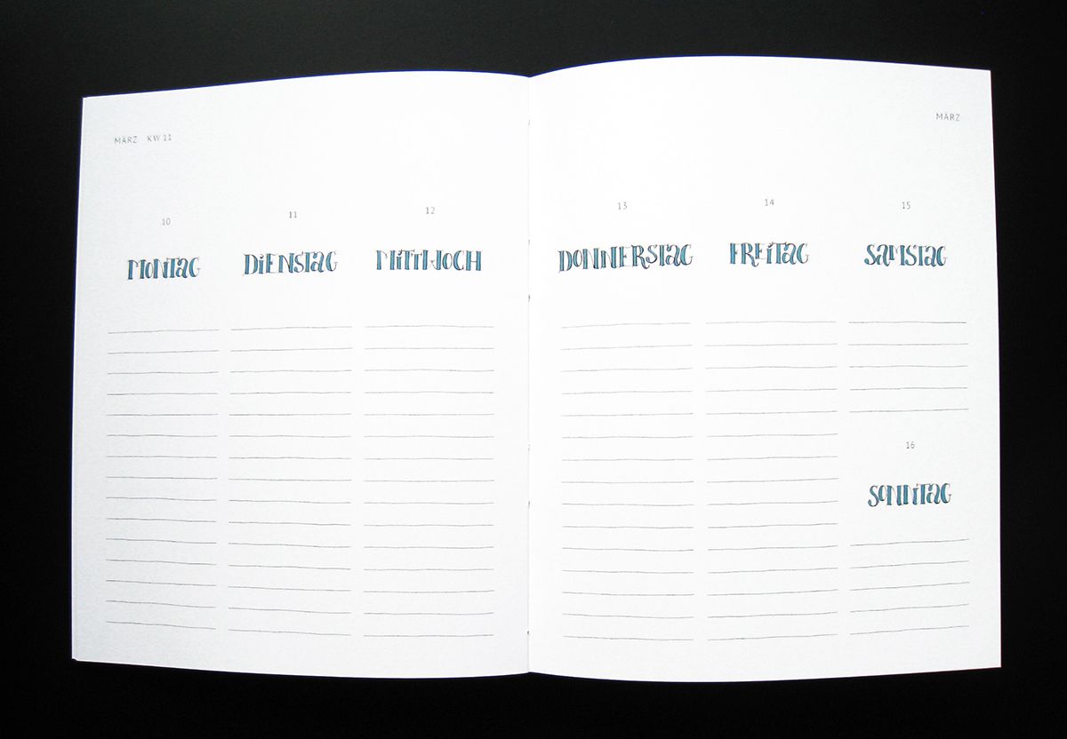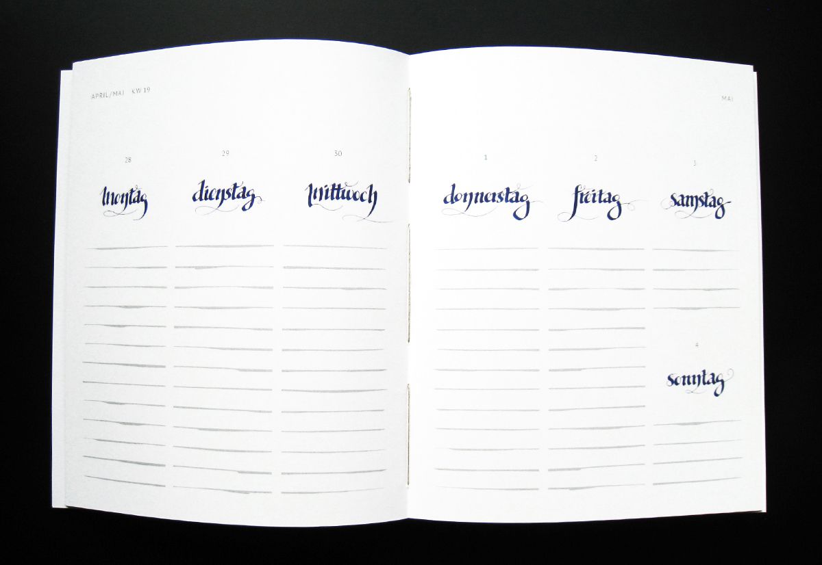 In einem Themenkalender habe ich einen Auszug des aktuellen Geschehens rund ums Thema »Hand Lettering« festgehalten. Zwischen den einzelnen Monaten werden aktuelle Gestalter/Schriftkünstler aus unterschiedlichen Ländern mit einigen Arbeiten vorgestellt. Die Kalenderseiten beinhalten von mir gestaltete Hand Letterings, die vierteljährlich wechseln.