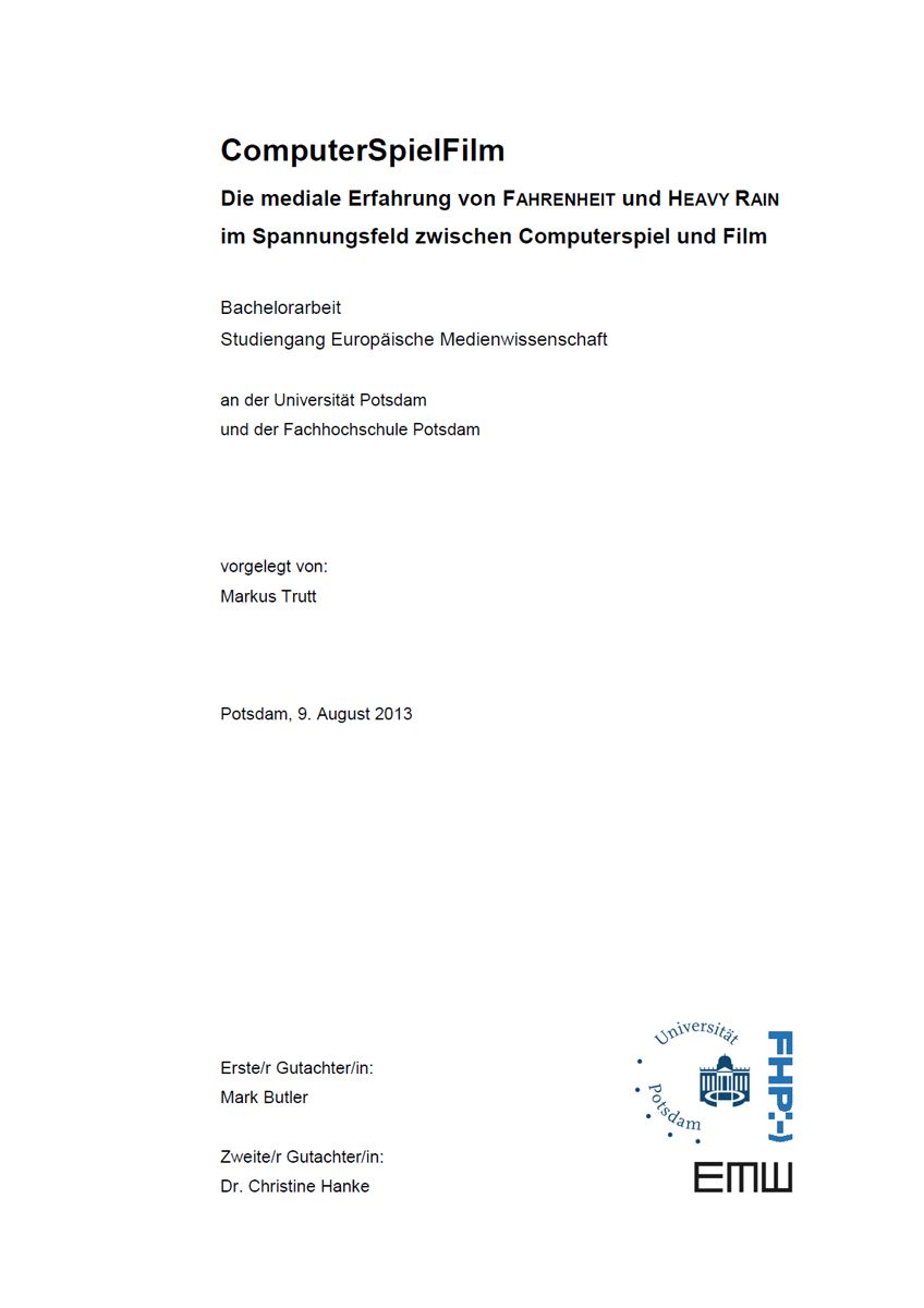 Die Bachelorarbeit widmet sich dem komplexen Verhältnis zwischen den Medien Computerspiel und Film. Die direkte Konfrontation dieser durch die zunehmende Kommerzialisierung digitaler Spiele führte nicht nur zu einer Konkurrenz auf dem Markt der Unterhaltungsmedien, sondern vielmehr auch zu fruchtbaren intermedialen Wechselwirkungen, die in eine Annäherung der Maßnahmen zur Erzeugung eines audiovisuellen Realismus mündete. Die Arbeit zeichnet wesentliche Eckpunkte dieser konvergenten Ausprägungen nach und nimmt schließlich die beiden Computerspiele FAHRENHEIT und HEAVY RAIN als extraordinäre Verkörperung jenes medialen Spannungsfeldes zum Anlass, um, insbesondere in Abgrenzung zum Film, Untersuchungen über das konstituierende Wesen des vielfältigen Computerspielmediums und seine ihm eigene Medialität anzustellen.