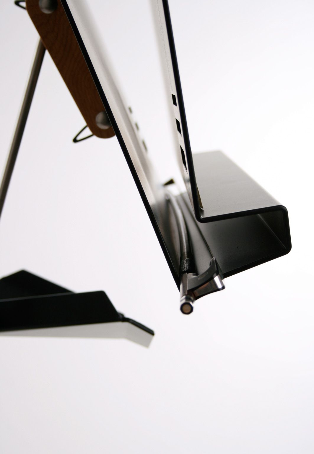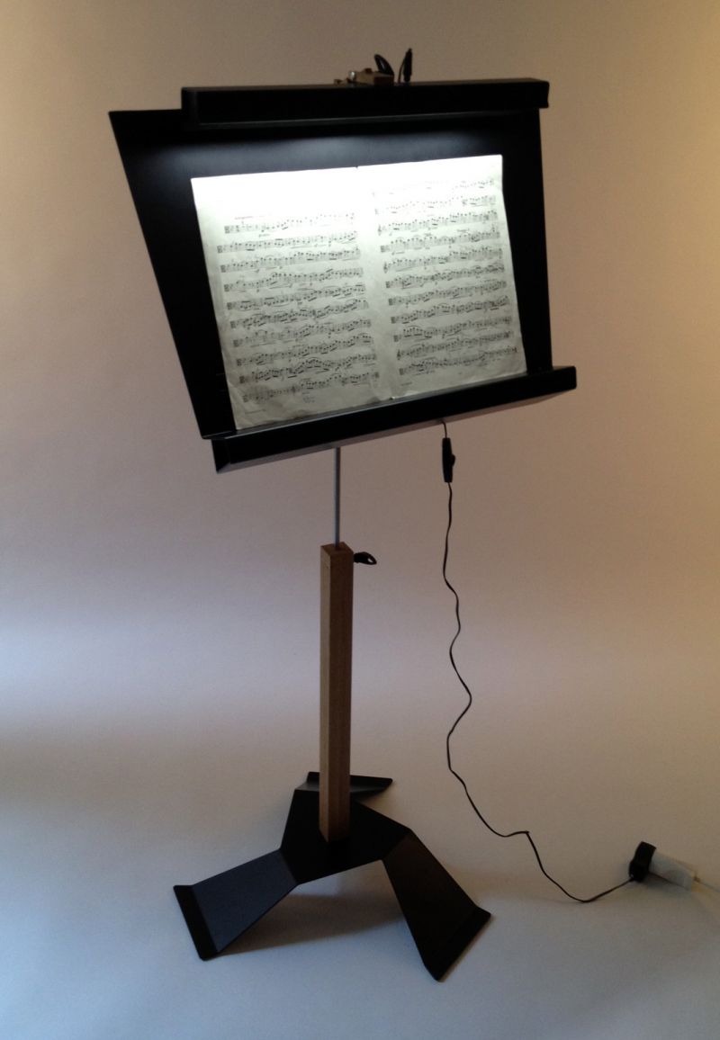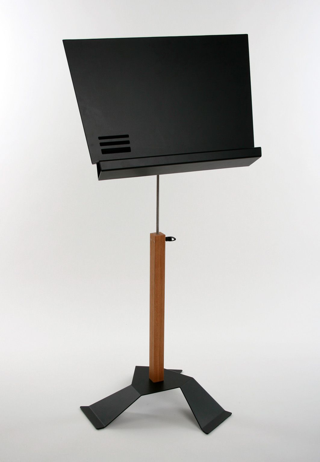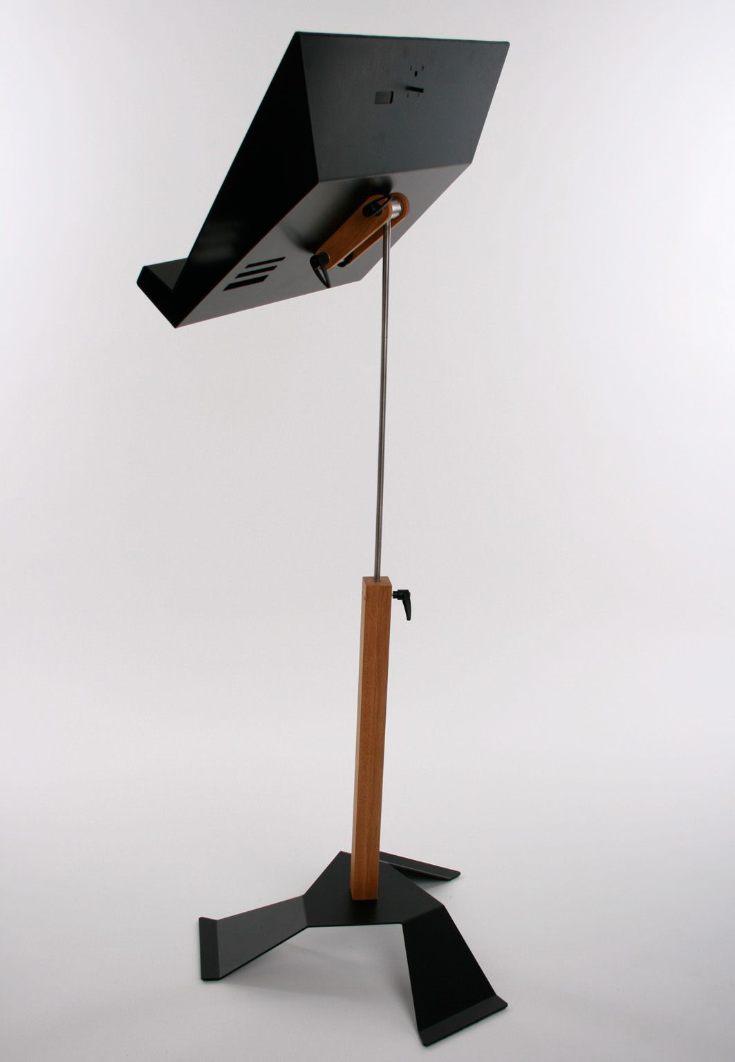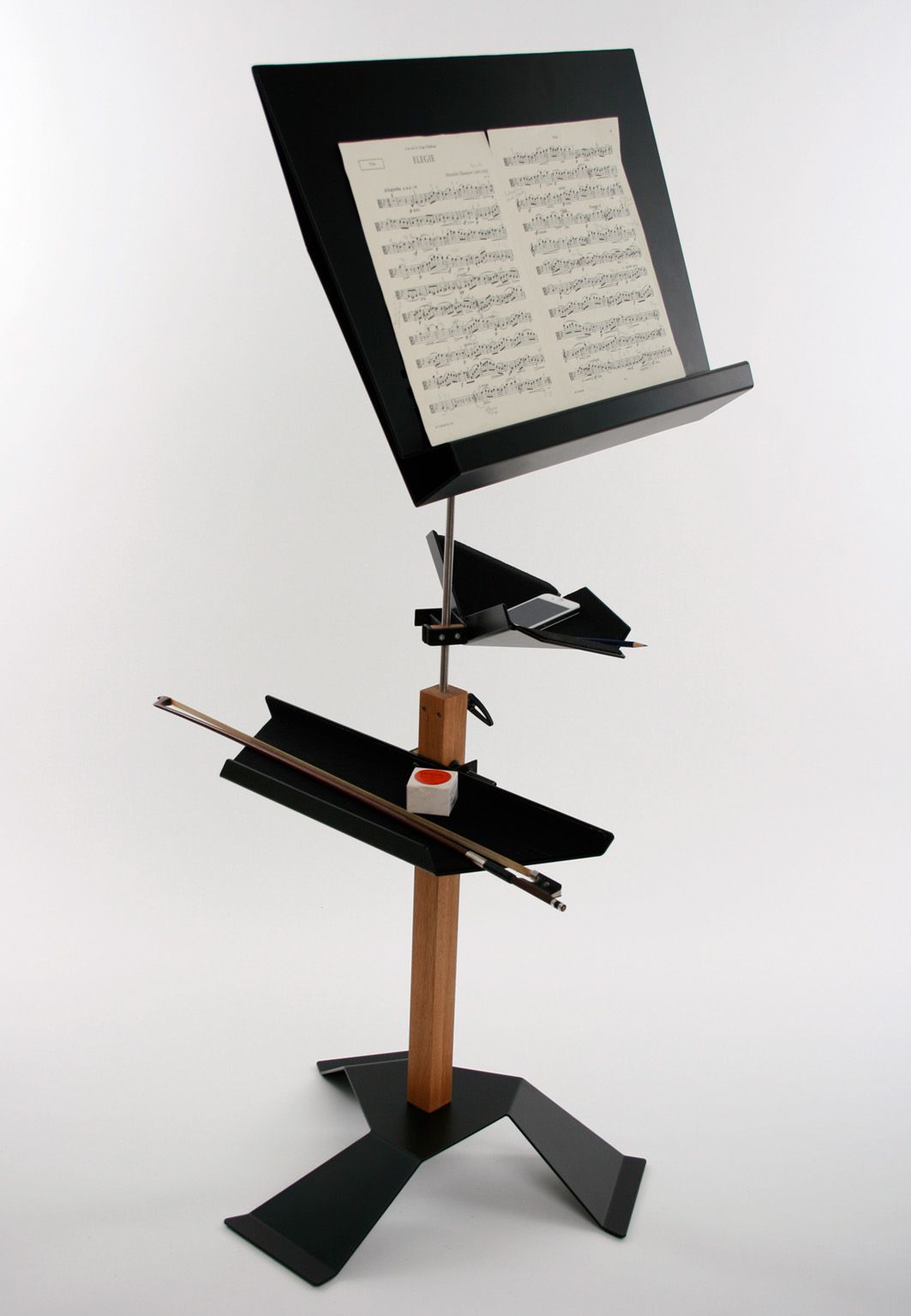 Die Arbeit befasst sich mit dem Notenständer, der die funktionalen Ansprüche des Orchestermusikers erfüllt und darüber hinaus dem Konzertbesucher ein positives optisches Erlebnis verschafft, während er der Musik lauscht.